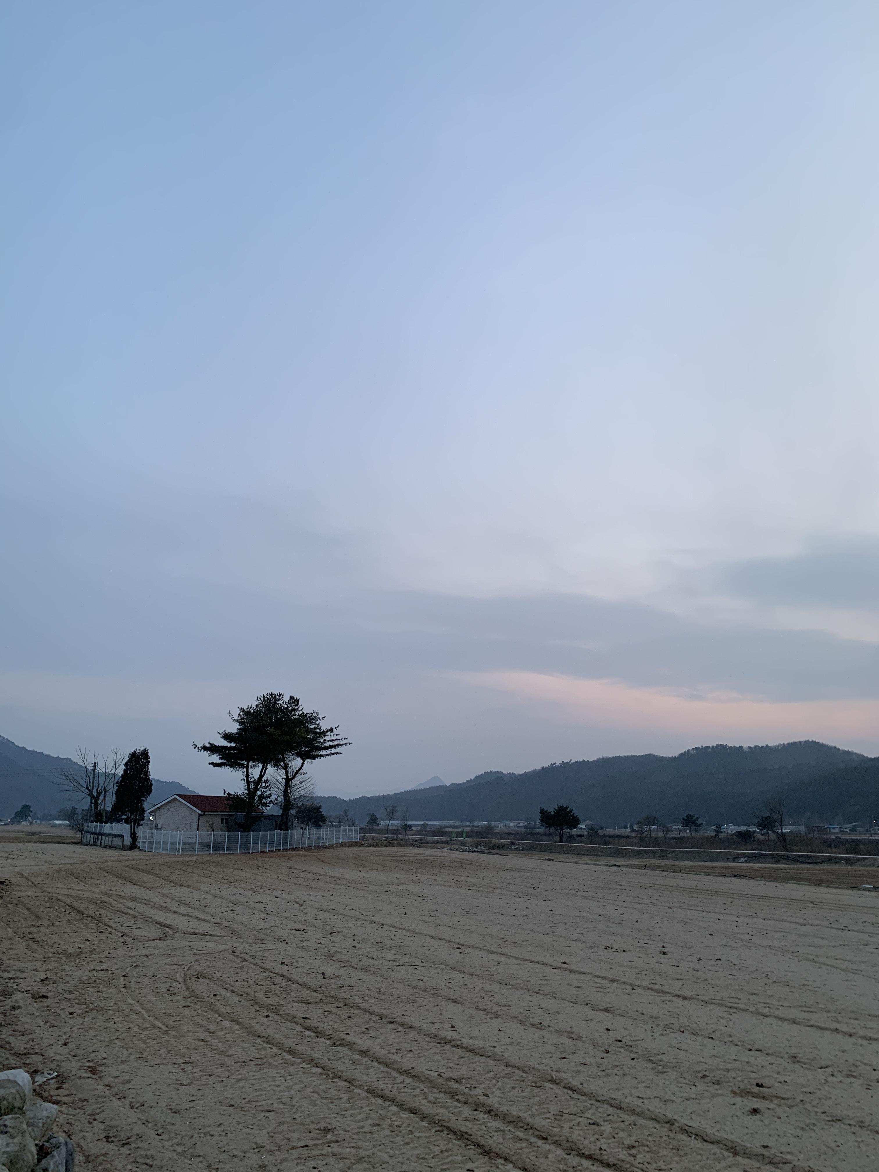 해질녘 분홍하늘과 그림같은 집이함께 보이는 곳